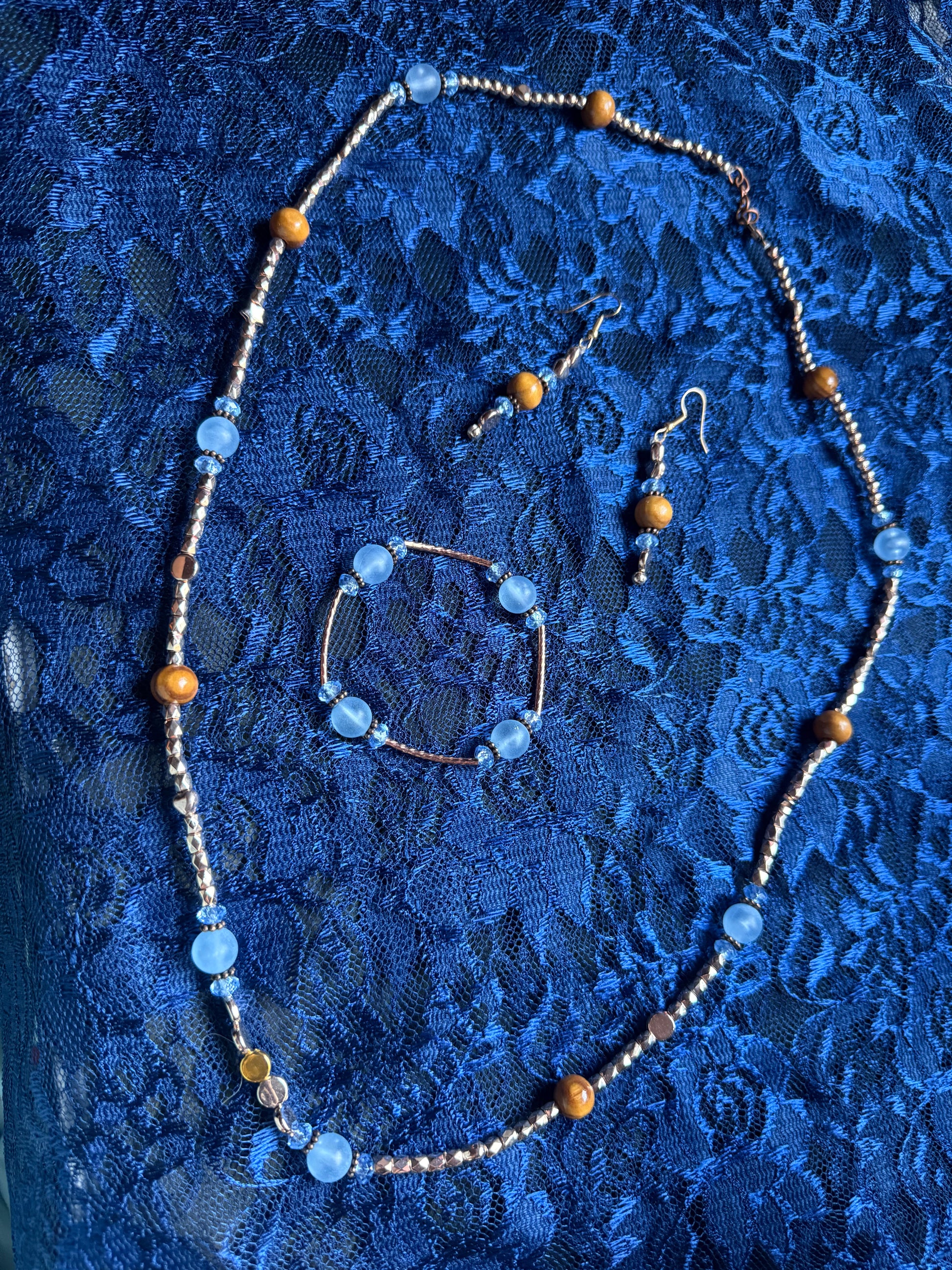 Stunning set with necklace, bracelet and earrings in blue and rose gold beads. A touch of wood beads add interest and texture.